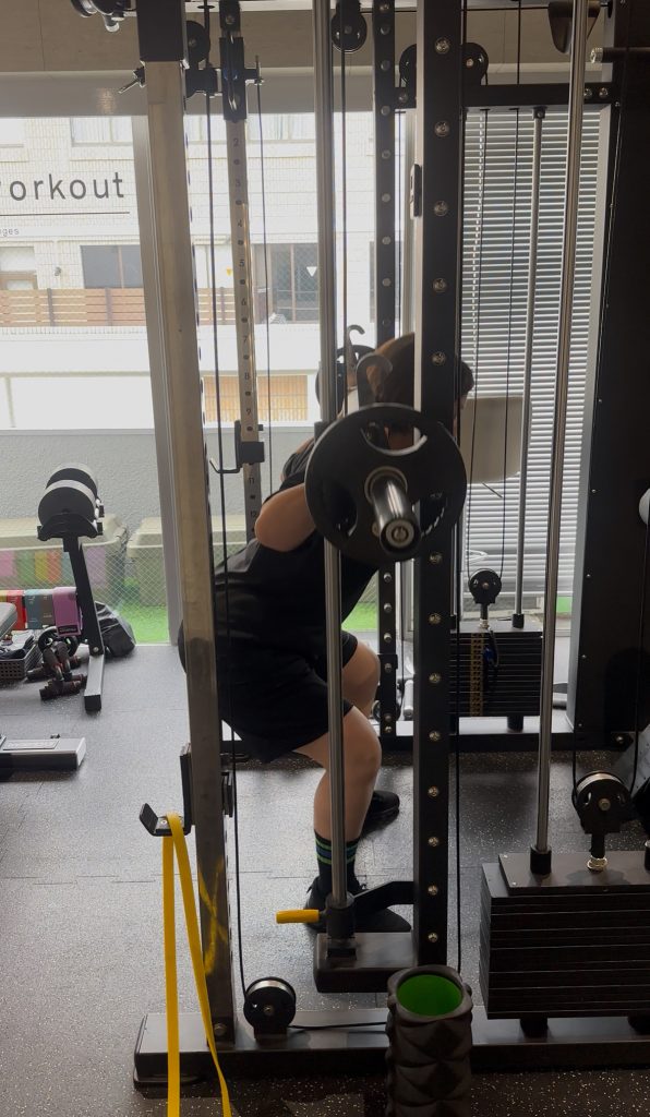 その結果、膝の違和感も軽減し、安定したフォームでスクワットを行うことができました。